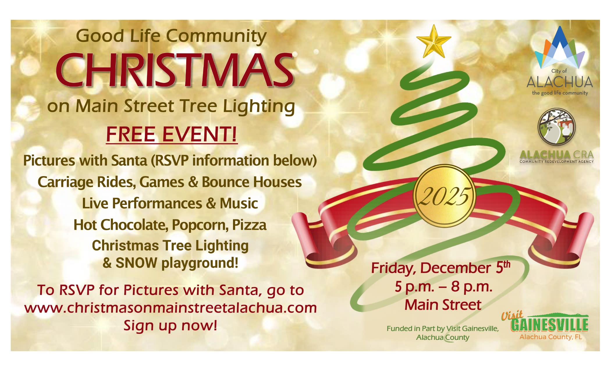 The Annual Christmas on Main, presented by the City of Alachua & co-hosted by the Alachua Chamber, is back and bigger than ever! Join us downtown for a magical evening filled with holiday cheer: ⭐ Tree Lighting at 6:30 p.m. 🎅 Photos with Santa & Mrs. Claus 💃 Children’s dances & live music ❄️ Snow playground & bounce houses 🎭 Christmas characters strolling Main Street 🎁 Fun activities hosted by local businesses—games, crafts, candy, and more!Images